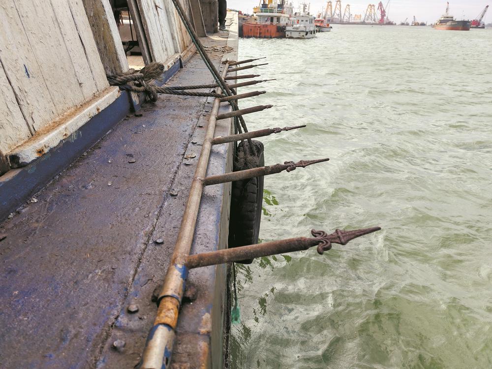 涉案漁船船體兩側(cè)非法安裝“尖刺”阻撓執(zhí)法 。 均市海洋局 供圖